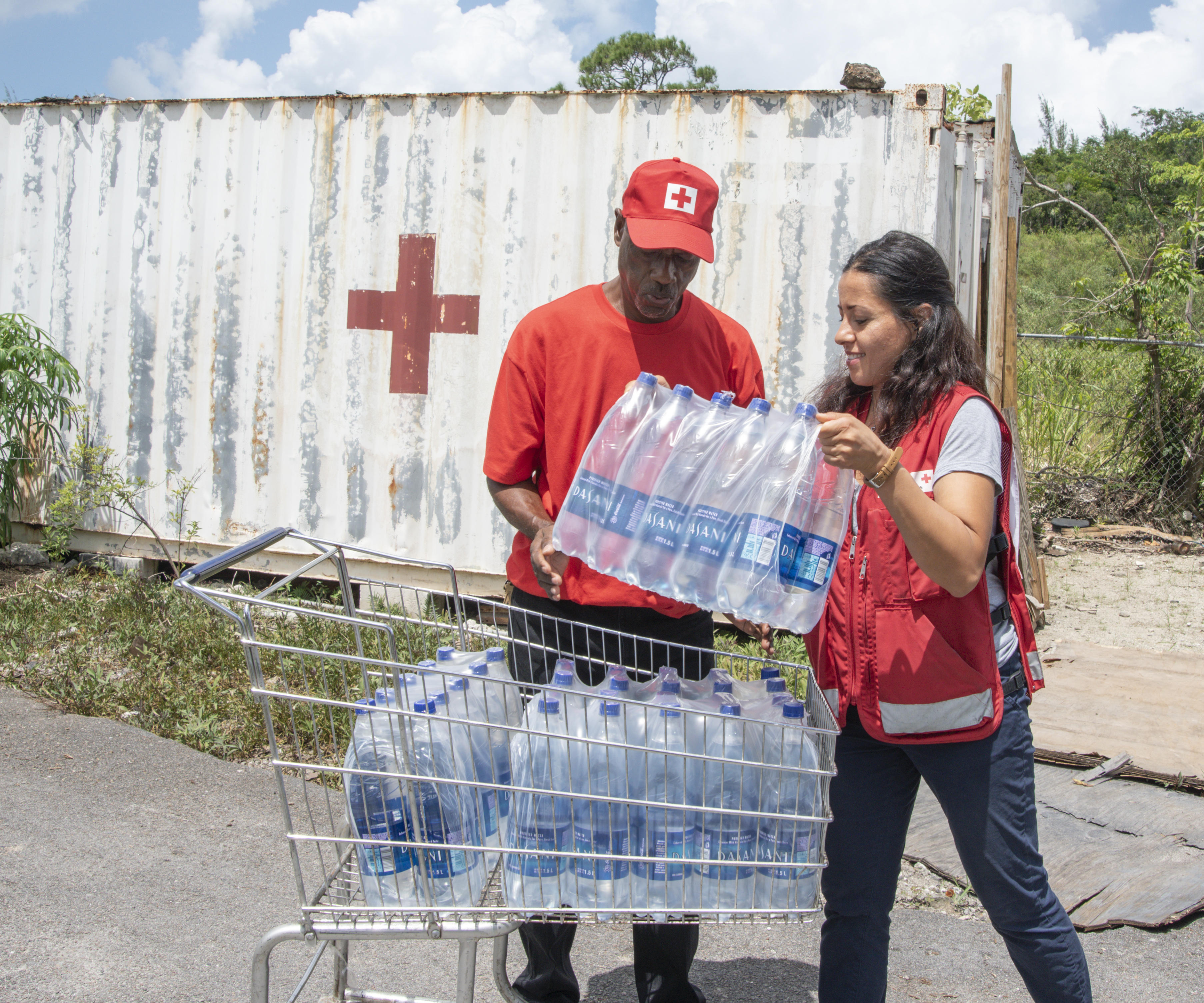 ライフラインが寸断された被災地の中には、暴風雨の影響で給水施設(水源)が海水や化学物質などで汚染されてしまった地域も。そこで赤十字ボランティアや現地の赤十字スタッフたちは、各地でペットボトルによる飲料水の配給を実施。グランドバハマ島では氷の配布も行いました。氷は飲料水としてだけでなく、食品の腐敗を防ぐという点でも役立ちます。