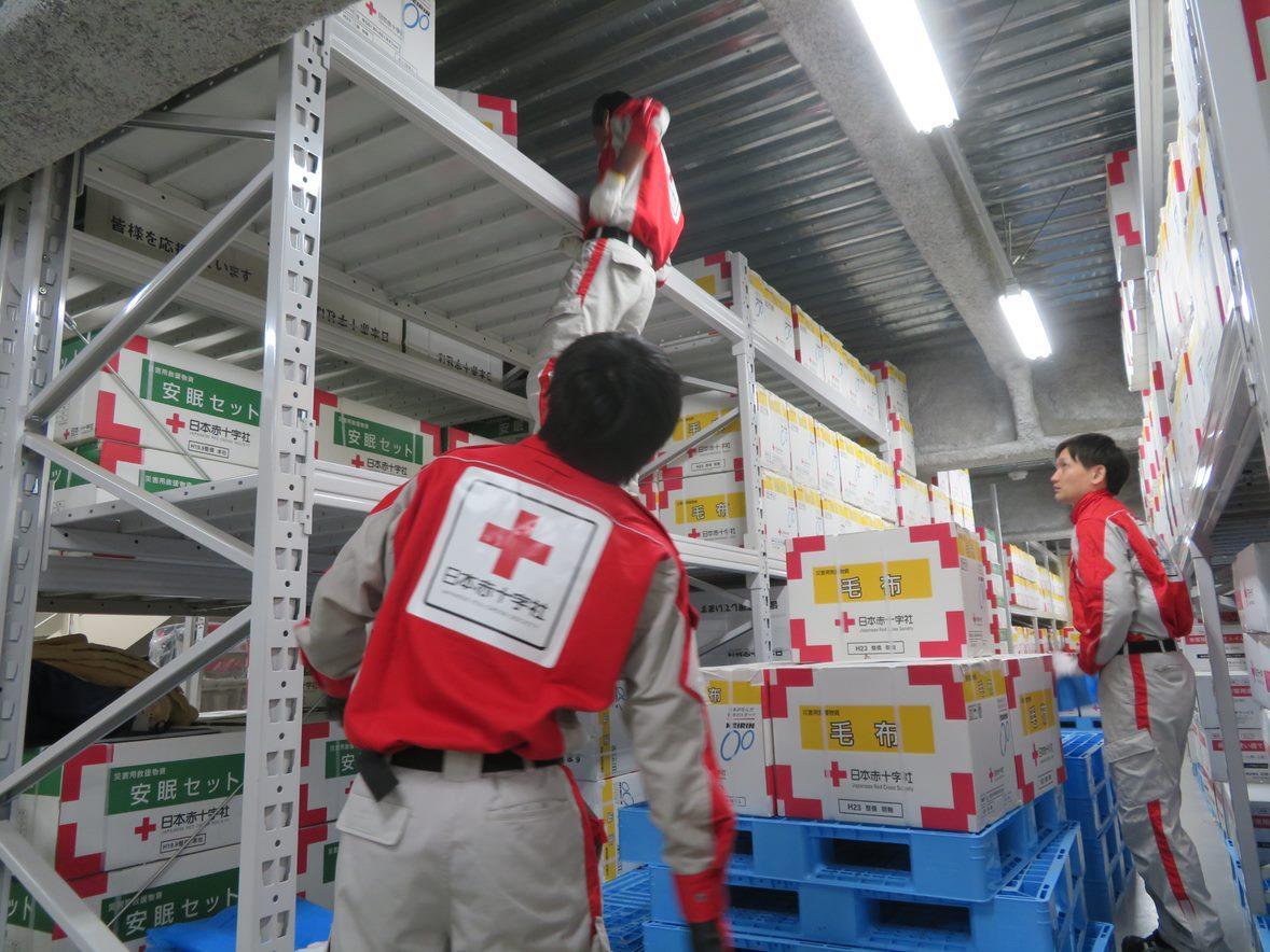 【宮城】備蓄倉庫から救援物資の運び出しをする宮城県支部職員。日赤各都道府県支部では物資を備蓄している