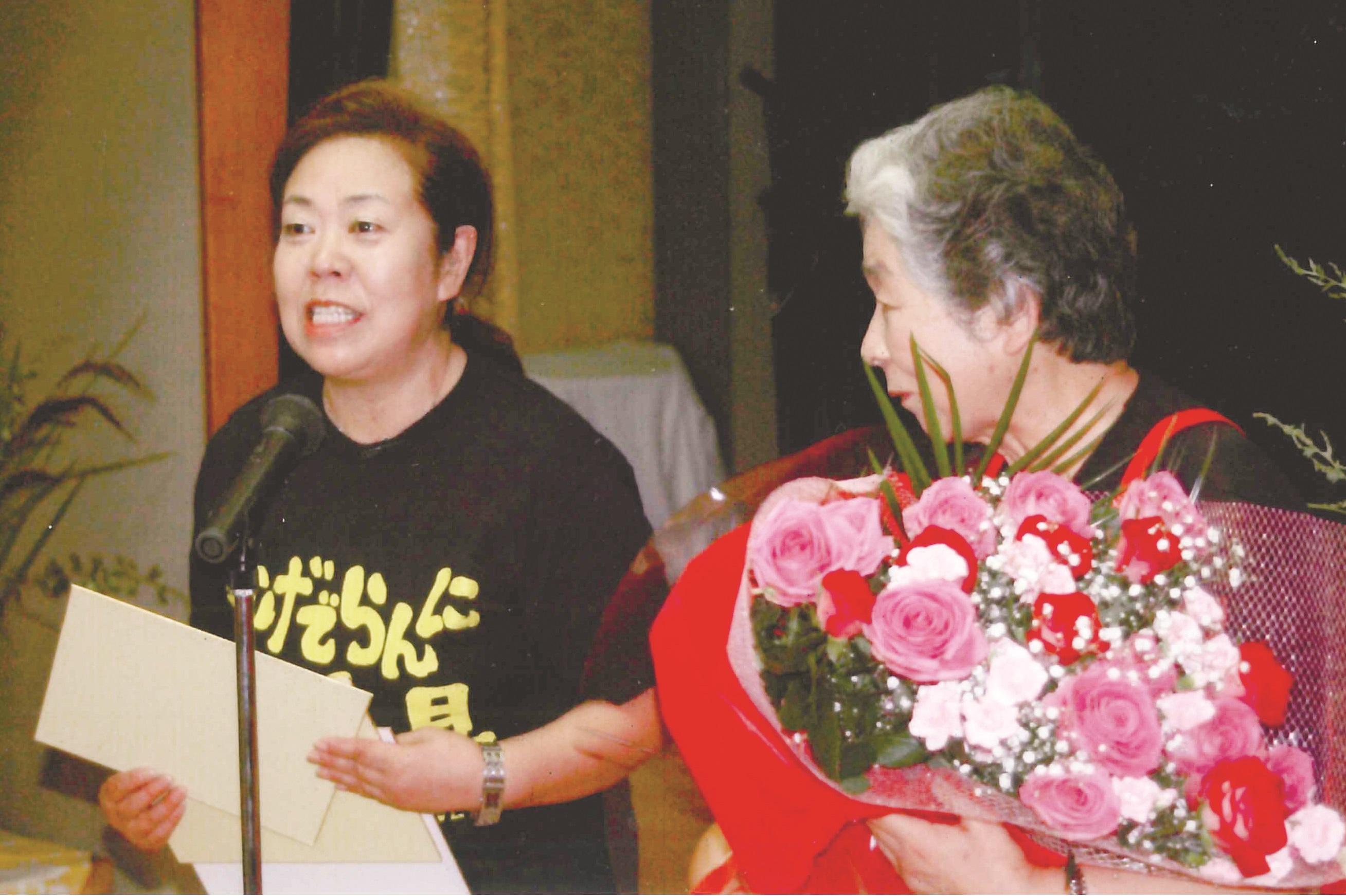 君津での最後の交流会。花束を受け取る鎌田委員長(右)と、お礼の言葉をのべる田中さん(左)