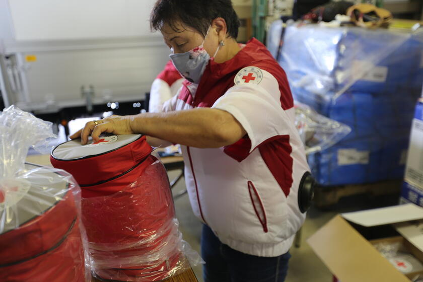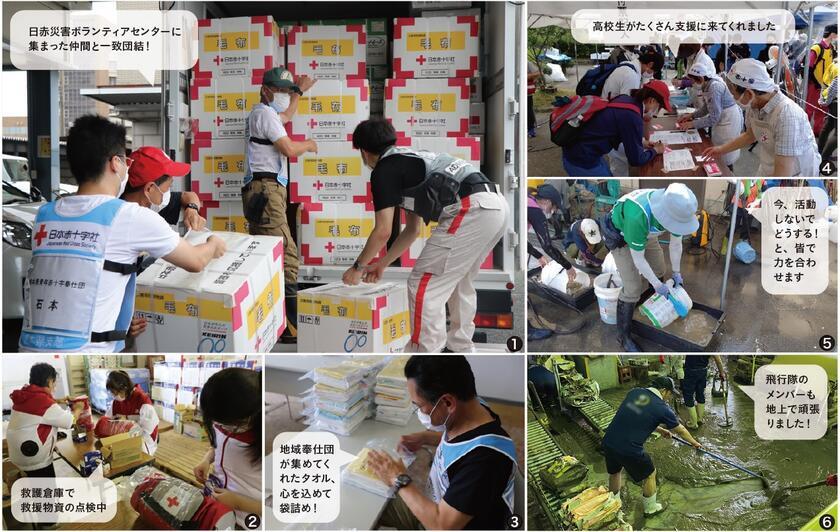 日赤熊本県支部では発災直後から支部内に赤十字ボランティアのためのセンターを開設。赤十字ボランティアは支部で備蓄していた救援物資の積み込み〈❶〉など精力的に活動を開始。配付する緊急セットに不備がないよう電池交換を行ったり〈❷〉、支援物資の仕分けやパッキングをする〈❸〉など支部内での作業の他、県内各地の地域赤十字奉仕団はタオル収集や被災地災害ボランティアセンターでの運営支援にも参加〈❹・❺〉、赤十字飛行隊熊本支隊も被害の大きい事業所からの要請に応じて地上支援に駆けつけ〈❻〉、それぞれが自発的な活動を展開しました。