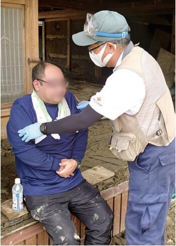 「 この暑さで、膝の高さまでたまった泥の中で泥かきをする。被災家屋の清掃作業は過酷です。巡回中、3日に1人は熱中症の初期症状が出る方がいます」。救急奉仕団の堀徹男さんは連日休みなく活動する理由をこう語りました。