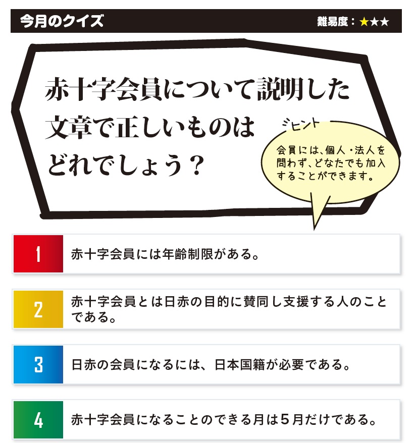 今月は「赤十字運動月間」です。赤十字の活動にご理解とご協力を呼びかけるため、毎年5月は全国各地でさまざまな取り組みが行われています。そこで、今回のテーマは「赤十字会員」。クイズで赤十字の会員制度について知識を深め、世界中で苦しんでいる人々を救うための活動やご寄付に興味を持ってくださる方が増えたらうれしいです。それでは問題です!