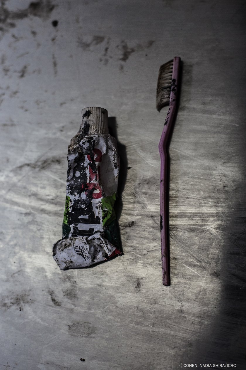 1998年2 月、コソボ紛争勃発。「民族浄化」から約25万人のアルバニア系住人が着の身着のままで逃げ、極寒の森に隠れた。紛争終結から15年後、紛争の行方不明者を捜索するICRCは古い採石場に埋められた52人の遺体を発見。写真は男性の遺体と一緒に回収した歯ブラシと歯磨き粉。