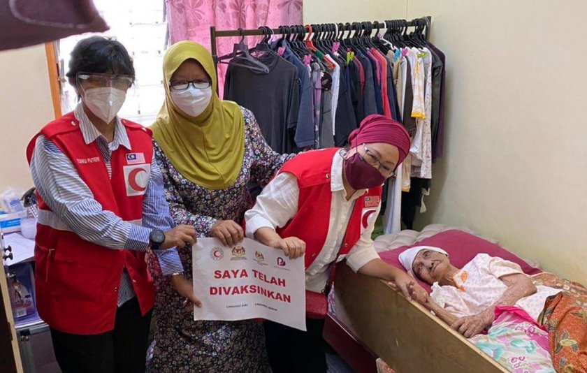ワクチン接種のため寝たきりの高齢者を訪問するマレーシア赤新月社の医療チーム
