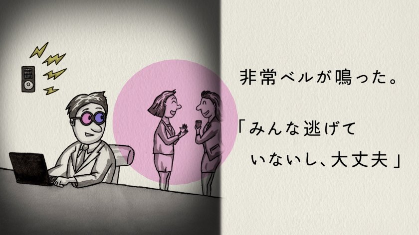 上の質問で回答(1)は「非常ベル」=「点検」という過去の先入観から自分にとって危険な状況と認識できない正常性バイアスが働いています。また、(3)は「非常ベル」=「火事」=「煙が見える」という固定観念から、火事以外の危険の可能性があることを認識しない正常性バイアスが働いています。正常性バイアスは、異常なことが起こった時に「大したことじゃない」と落ち着こうとする心の安定機能のようなもの。日常生活では、不安や心配を減らす役割があります。しかし、緊急事態では逃げ遅れなど、危険に巻き込まれる原因にもなります。