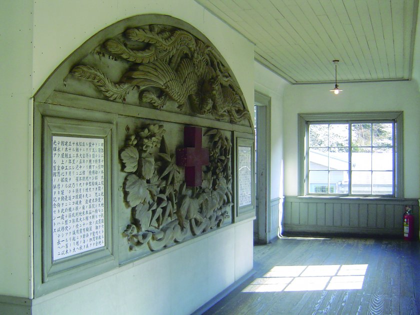 現在、愛知県の博物館 明治村にある日本赤十字社中央病院の木造建築は、東京・広尾の日赤医療センターの旧病院舎の一部です。皇室から建築資金10万円と、渋谷の御料地の一部が下賜されたことで、明治23年に竣工しました。設計は、赤坂離宮などを手掛けた宮内庁技師・片山東熊によるもので、細部にわたり繊細な装飾が施され、美しい建物であると同時に、当時の最先端の病院機能を備えました。昭和49年の病院立て直しの際、9棟あるうちの一棟が博物館明治村に移築され、現在も登録有形文化財として保存展示されています。内部の壁には当時病院を飾った社章「桐竹鳳凰」の木彫りの彫刻が今も遺されています。「桐竹鳳凰赤十字」は、昭憲皇太后から示されたかんざしのデザインに基づくもので、鳳凰は卵やひなを守るような姿勢で、両羽を大きく広げて赤十字マークを抱いています。赤十字事業への協力などに功績のある方々が授与される有功章や、赤十字の職員章にも刻まれているデザインです。