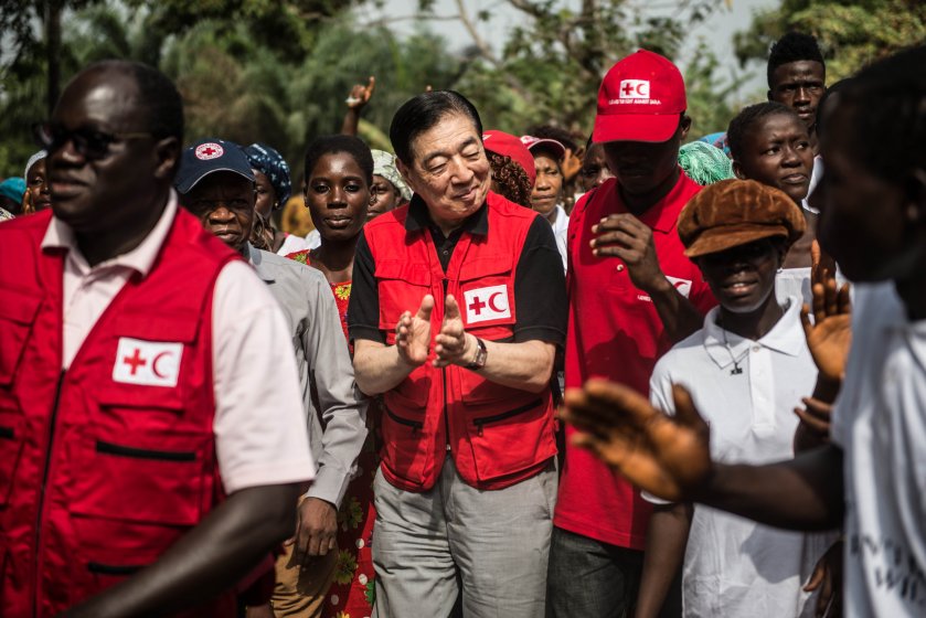 2016年、シエラレオネ。現地赤十字職員、ボランティアから大歓迎を受ける近衞連盟会長(当時)