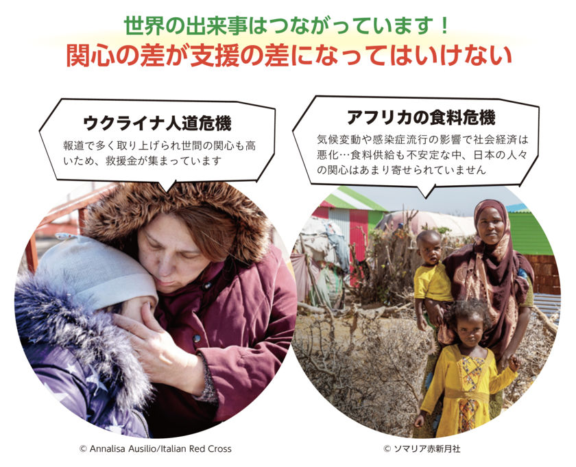 [ウクライナ人道危機]・・・報道で多く取り上げられ世間の関心も高いため、救援金が集まっています/[アフリカの食料危機]・・・気候変動や感染症流行の影響で社会経済は悪化…食料供給も不安定な中、日本の人々の関心はあまり寄せられていません