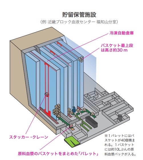 福知山分室の場合、原料血漿は48万L(約10L入るバスケットが4万8000個)の保管が可能。冷凍自動倉庫の最上段のバスケットの高さは約30m(マンション10階相当)