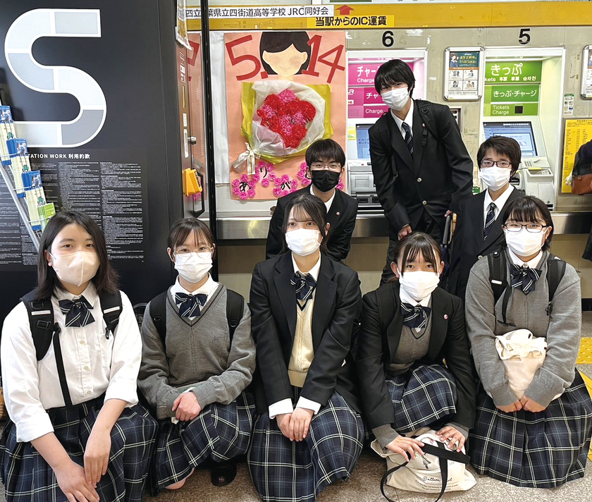 母の日のメッセージポスターを駅に提示。JRCメンバーと松本さん(中央)