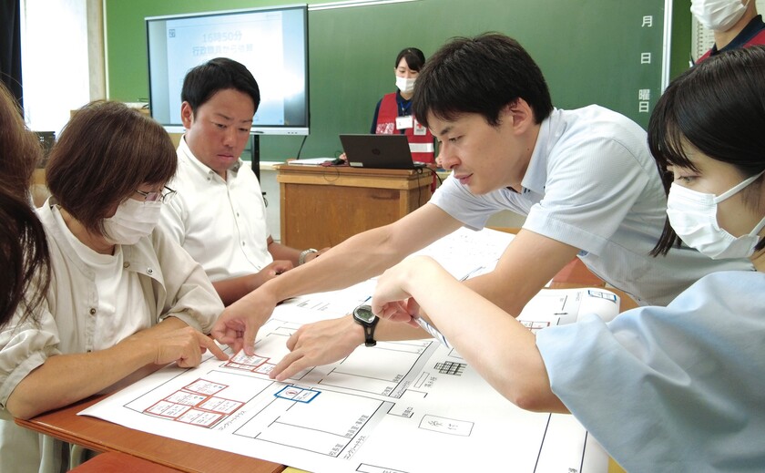 今回のセミナーでは、学校の先生たちがグループワークに取り組みました。同中学校の野口千津子校長は、災害時には学校が避難所として活用され、教員が運営する立場になることをふまえ、