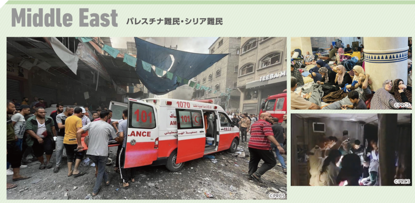 現在、中東ではイスラエル・ガザの人道危機が発生していますが、これによってまさに数多くの難民が窮地に追い込まれています。日赤が2019年から医療技術支援をおこなってきたパレスチナ赤新月社*(パ赤)のアルクッズ病院も影響を受けました。病院には攻撃予告が届きましたが、当時院内には数百人の患者だけでなく1万4000人以上の避難者が身を寄せていたため、こうした人々を残しては離れられないと、パ赤は退避の要求を拒否。救急車も攻撃対象になり、パ赤の職員にも犠牲者が出ました。瓦礫に埋もれて亡くなった子供が当直外科医の子供だったことも…。さらに、近くに着弾したことで病院の窓ガラスが飛び散り、破片がベッドにも突き刺さるなどし、遂には、発電用燃料も無くなり全ての診療活動が停止。病院は閉鎖に追い込まれました。