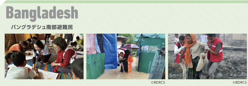 2017年8月にミャンマー・ラカイン州で発生した暴力により、隣国バングラデシュに大量の避難民が流出してから6年。人々は、避難民キャンプからの自由な移動も許されず、先行きの見えない避難生活を送っています。世界各地で災害や紛争が続く中、国際社会からの関心が徐々に薄れ、食料支給額は段階的に引き下げられており、今後子どもの栄養不良が大きな問題となることが懸念されます。日赤が運営するキャンプ内の診療所には、キャンプ生活の制約やストレスが要因と思われる生活習慣病を訴える人が多く訪れています。また、狭く劣悪な衛生環境で家族全員が生活するため、皮膚病やデング熱など、感染症のまん延も問題となっています。