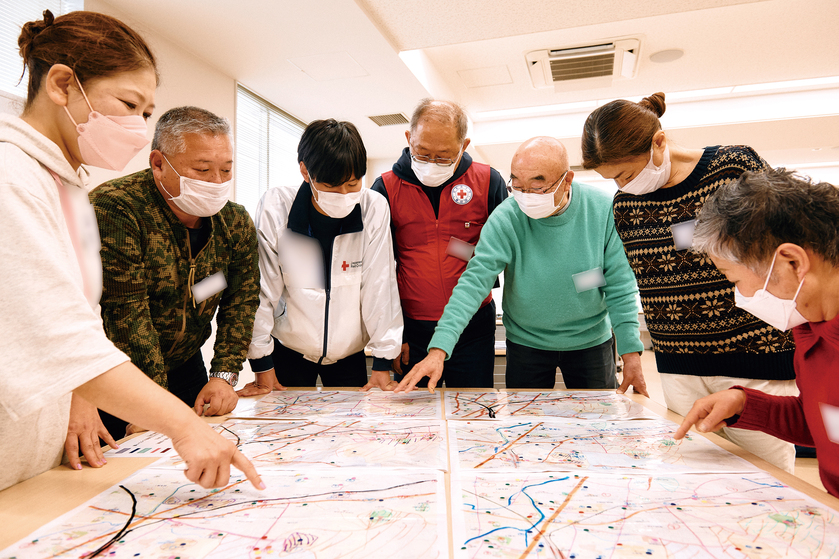 しかし、これらの考え方は、平穏な日常生活では、つい忘れてしまうことも…。そのため日赤は、年間を通じて赤十字防災セミナーを全国各地で開催。同セミナーの特徴は、体験して自ら考える、さまざまな参加型カリキュラムであること。地図に防災設備や危険な場所を書き込み、グループで情報を共有しながら、災害別の自宅や地域での被害を把握する「災害図上訓練(DIG)」、大規模地震の避難所生活をカードゲームで学び合う「ひなんじょ たいけん」など、身近なところから防災に取り組み、自助の力、そして地域で助け合う共助の力を育てるお手伝いをしています。