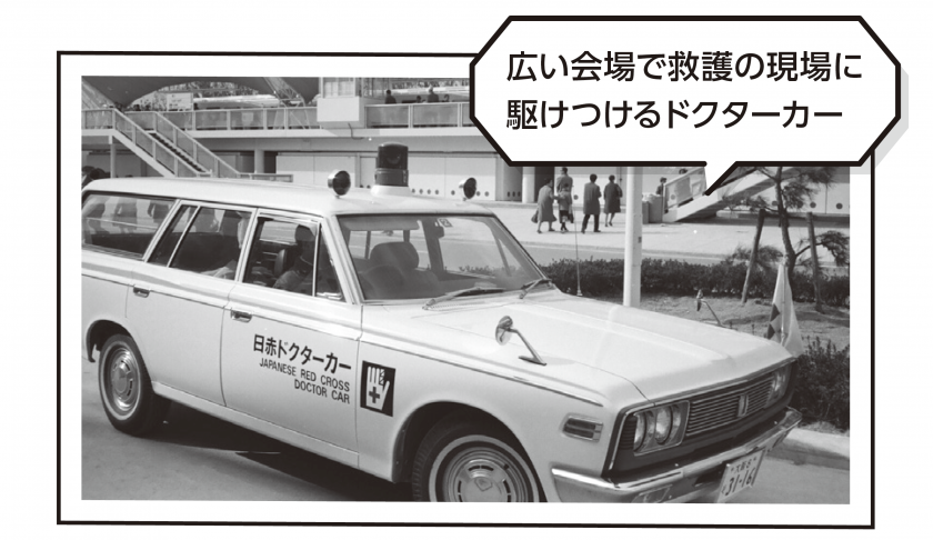 1970年に日本で初めて行われた大阪万博では、日赤の力が大いに発揮されました。開催地の大阪赤十字病院から医師や看護師を派遣し、会場の診療所内に日赤の救護本部を設置して、2台のドクターカーを配備。救急の一報が入ると医師らはドクターカーに乗って現場に急行。大阪府赤十字血液センターは万が一に備えて各血液型の保存血液を会場に常置しました。連日、20万人以上が訪れる会場ではケガ人も多く、「動く歩道」で発生した40人余りが負傷する事故、集団感染など、さまざまなトラブルが発生。赤十字の旗を掲げたドクターカーが走り回ってその処置や搬送にあたり、医師や看護師が迅速に治療をする姿は、国を挙げて開催された国際イベントの中で、赤十字の使命を体現するものでした。