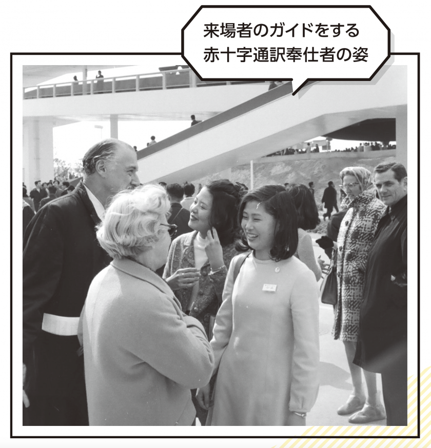 また、海外からの来場者をサポートするべく、日赤大阪府支部は万博の約2年前から、通訳奉仕者の養成を開始。大阪府支部内に教室を設け、外国人講師を招いた定期的な講習により約300人の通訳奉仕者が誕生しました。その中から特に優秀な150人の通訳奉仕者が万博に派遣され、各国のイベントにおける通訳や外国人来場者の案内を務め、多くの人から感謝されたそうです。この通訳奉仕者たちは、後に「大阪府支部語学奉仕団」となり、その後50年にわたって活動が続けられました(コロナ禍を経て活動終了)。