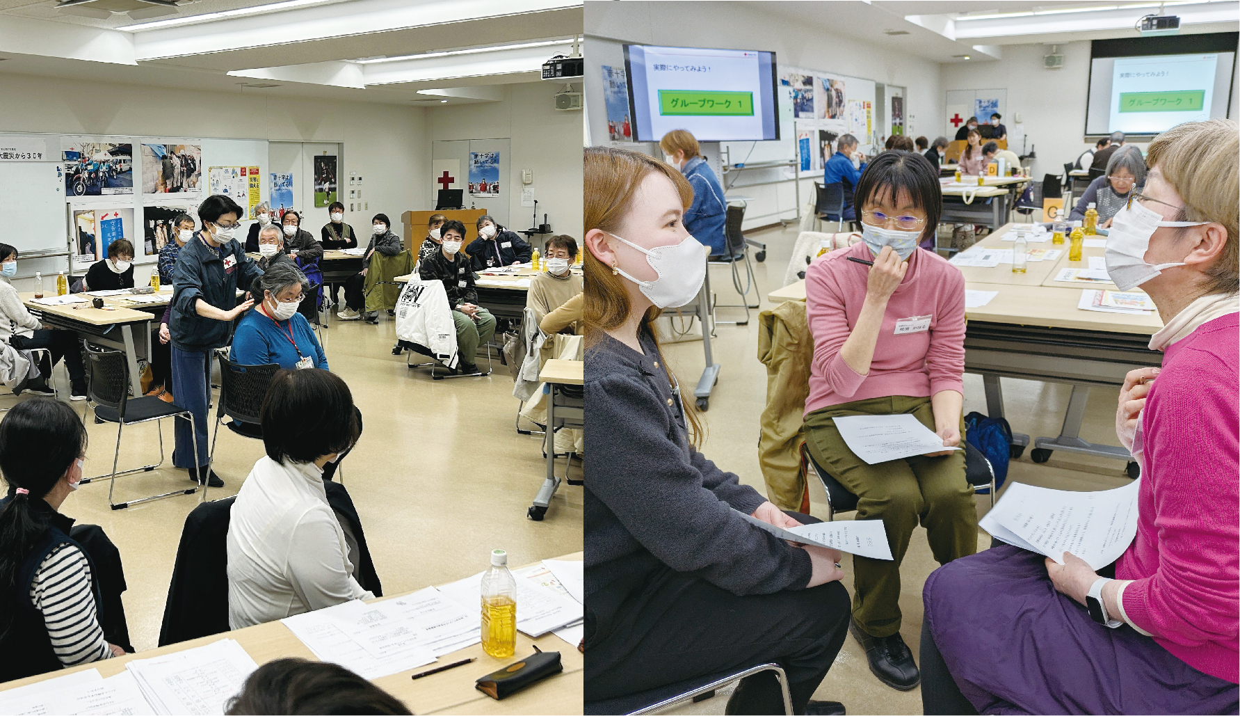 研修会には、防災ボランティアだけでなく、地域奉仕団や青年奉仕団など、総勢84人の赤十字ボランティアが参加。「こころのケア」や災害時の活動におけるポイントを座学で学んだ後、相手の気持ちになって寄り添う「傾聴」の具体的な方法を学びました。