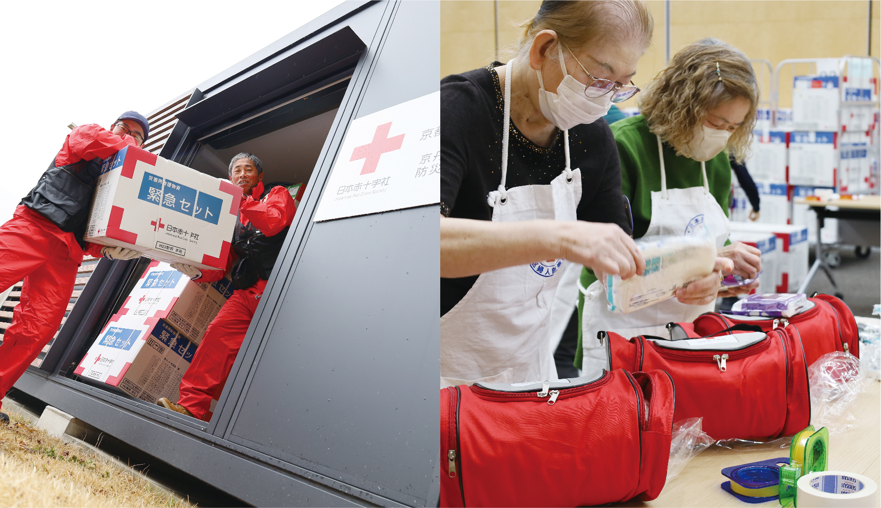 東日本大震災が発生した日である3月11日、日赤京都府支部では、赤十字ボランティアの連携による災害時用の備蓄品の整備が行われました。まず、赤十字防災セミナー指導者の小谷和弘さん、昨年に高校生で赤十字救急法指導員の資格を取った(※全国初)中村亮祐さんが支部職員と協力して、府内各地の防災倉庫から緊急セット約1000個を支部に搬送。