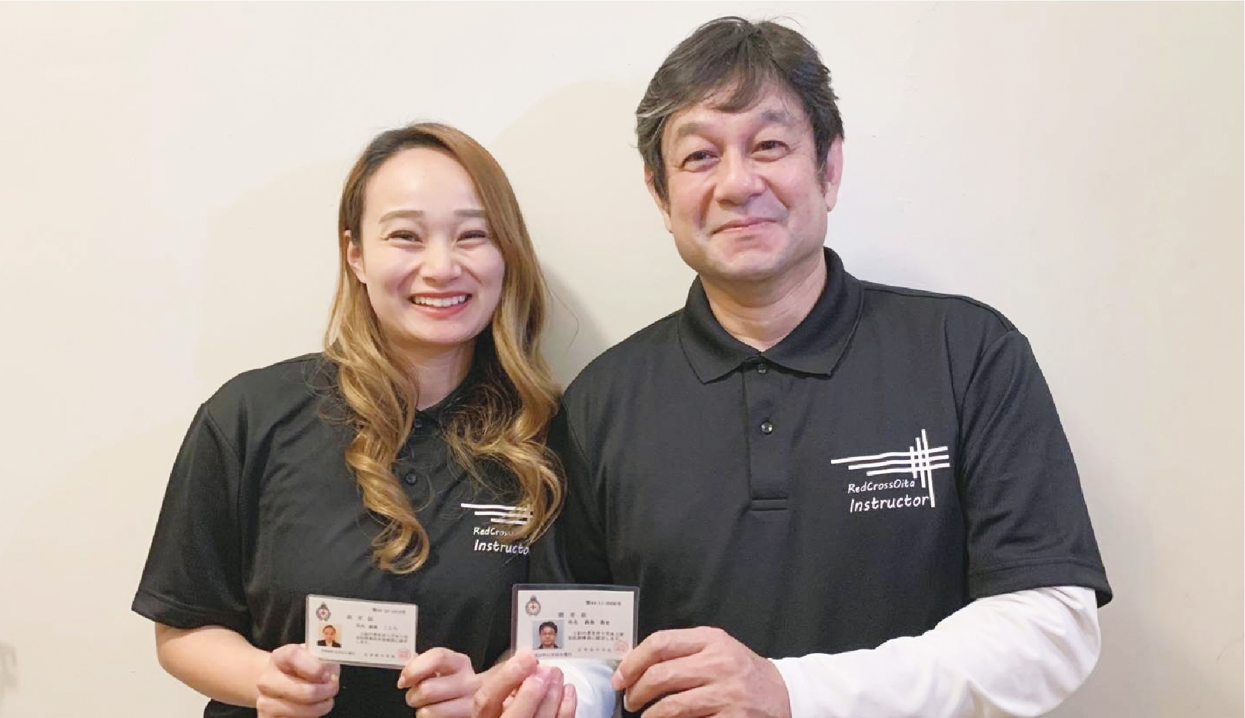 認定証を手にする、こころさんと貴史さん。大分赤十字病院の歯科技工士でもある貴史さんは、立ち泳ぎなどの練習を1年間続け、指導員認定を受けた