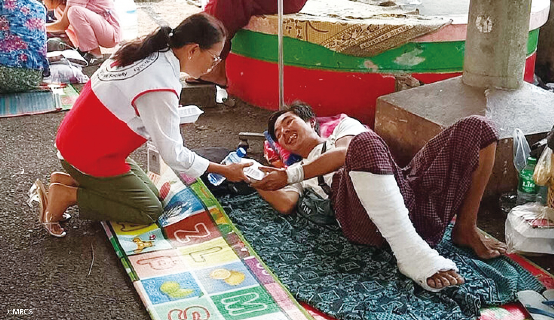 ミャンマー赤は、発災直後から緊急対策本部を設置し、本社の救援チームを派遣、被災地支部の赤十字ボランティアも動員して捜索・救助活動や、負傷者の応急手当および病院搬送、被害状況の調査を開始しました。