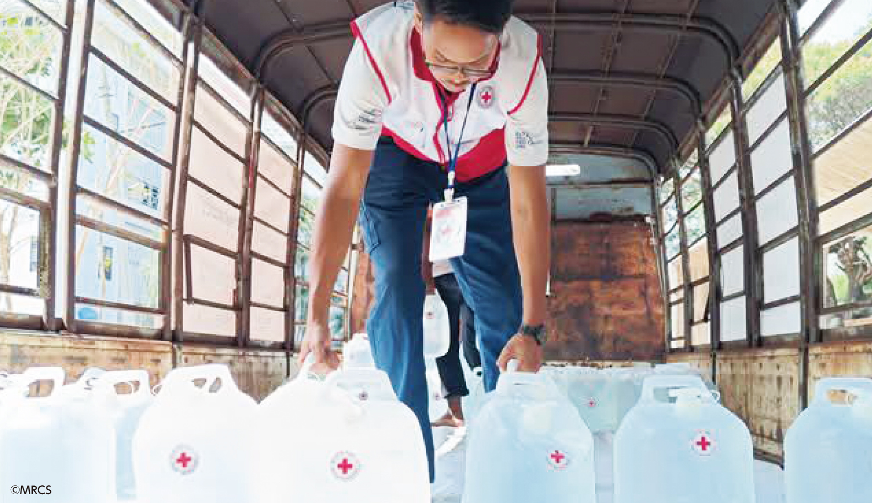安全な水の配布を行うミャンマー赤スタッフ。日赤はミャンマー赤スタッフが参加する給水・衛生の研修も支援した