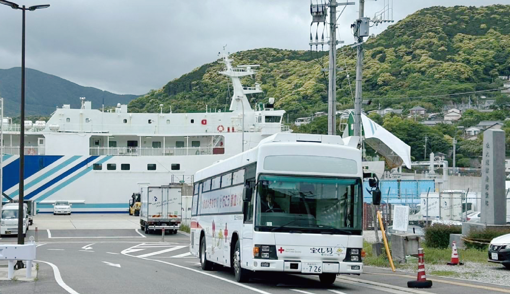 大海原を波に揺られて5時間。港を出た船は、献血バス1台、段ボール40個分の採血バッグ、搬送容器75個以上、その他にも大量の資材を積み、九州と韓国の間に浮かぶ島「対馬」に到着します。
