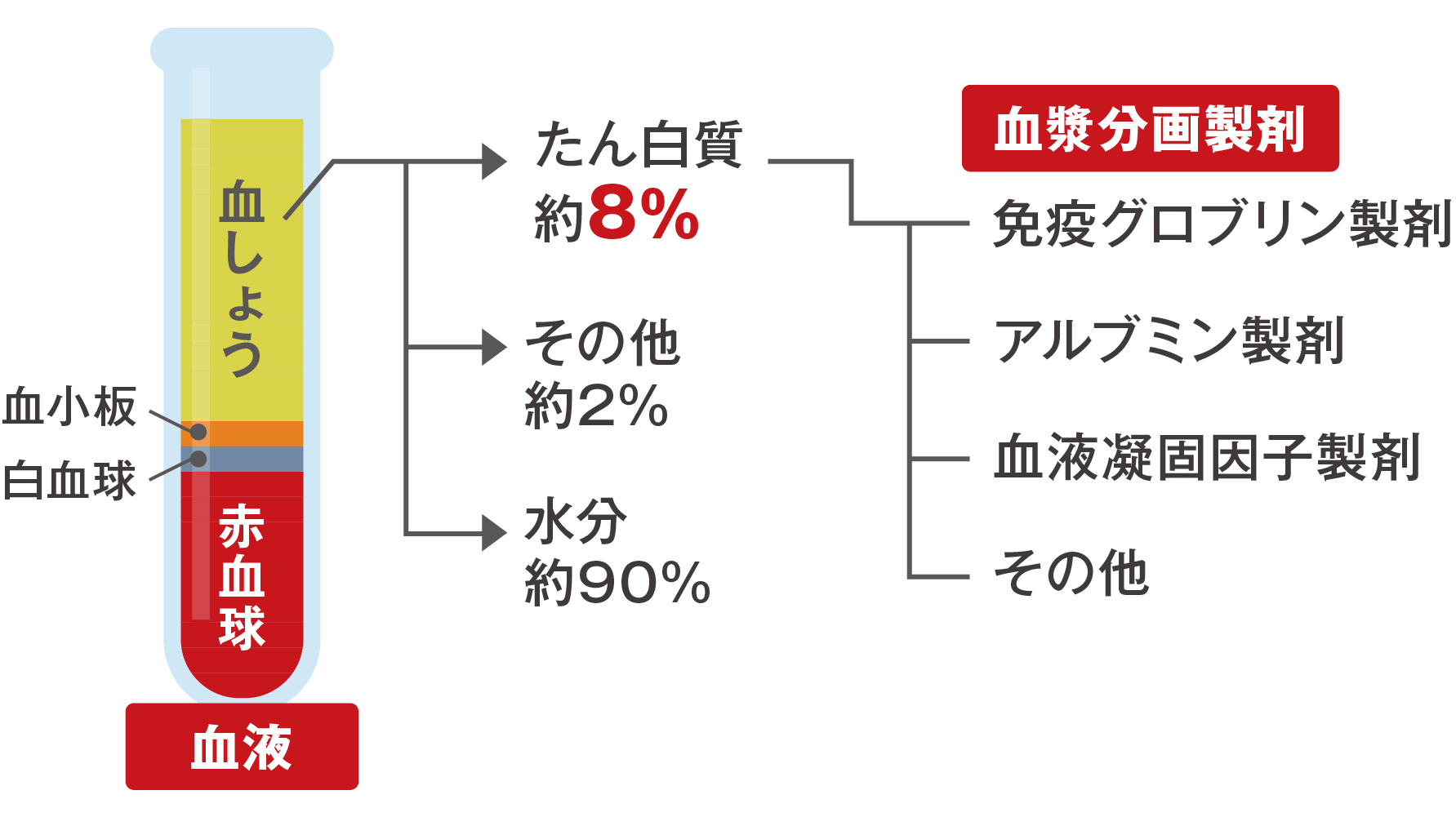 れいなさんを救った免疫グロブリン製剤は、血液の成分「血しょう」から抽出されるたん白質から造られる血漿分画製剤の一つです。