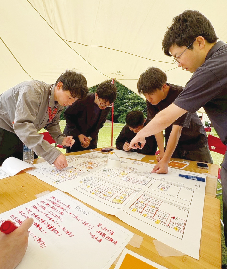 全国の自治体と143件の災害協定を締結し、防災・減災活動に積極的に取り組む日立建機日本株式会社からの依頼を受け、日赤の4支部(茨城・広島・愛知・北海道)では、5月から7月にかけて、日立建機入社2~3年目の若手社員を対象とした防災セミナーを各地のアウトドア施設で実施しました。野外にタープを設置し、災害時の避難所運営を疑似体験しながら、自助・共助・公助の大切さを学びました。