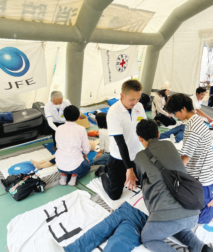 神奈川県支部には、JFEスチール京浜赤十字奉仕団があります。この奉仕団は、阪神・淡路大震災を機に、製鉄所内で培ってきた救急法の知識・技術を赤十字ボランティアの活動を通じて地域に広め、生かしていこうと1997年に設立。毎年5月に同社敷地内で開催される「ふれあい祭り」では、救急法体験のブースを出展しており、今年は180人以上の方に救急法をレクチャーしました。