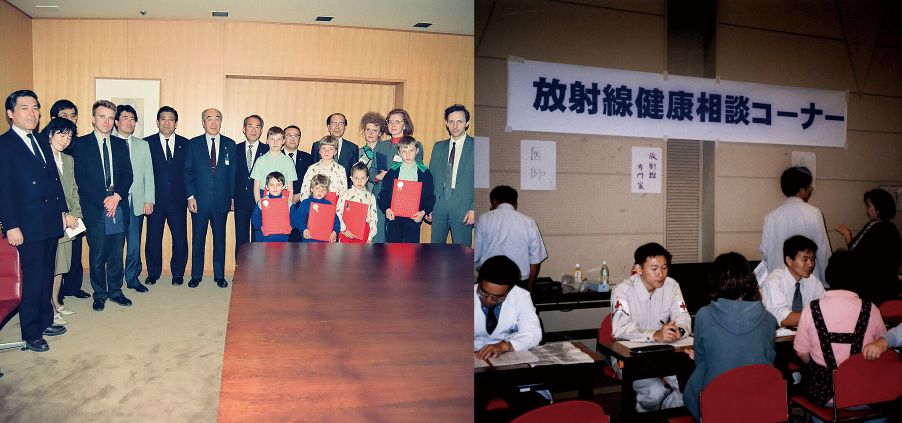 (左)日赤は1991年4月からチェルノブイリ原発事故の被ばく児童や医療関係者を7回にわたり招聘。広島、長崎両赤十字原爆病院などで検診・研修を実施した
