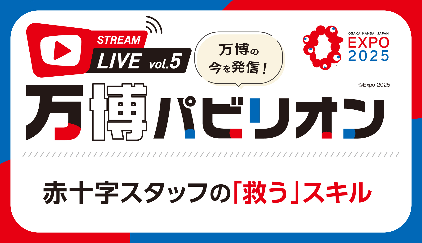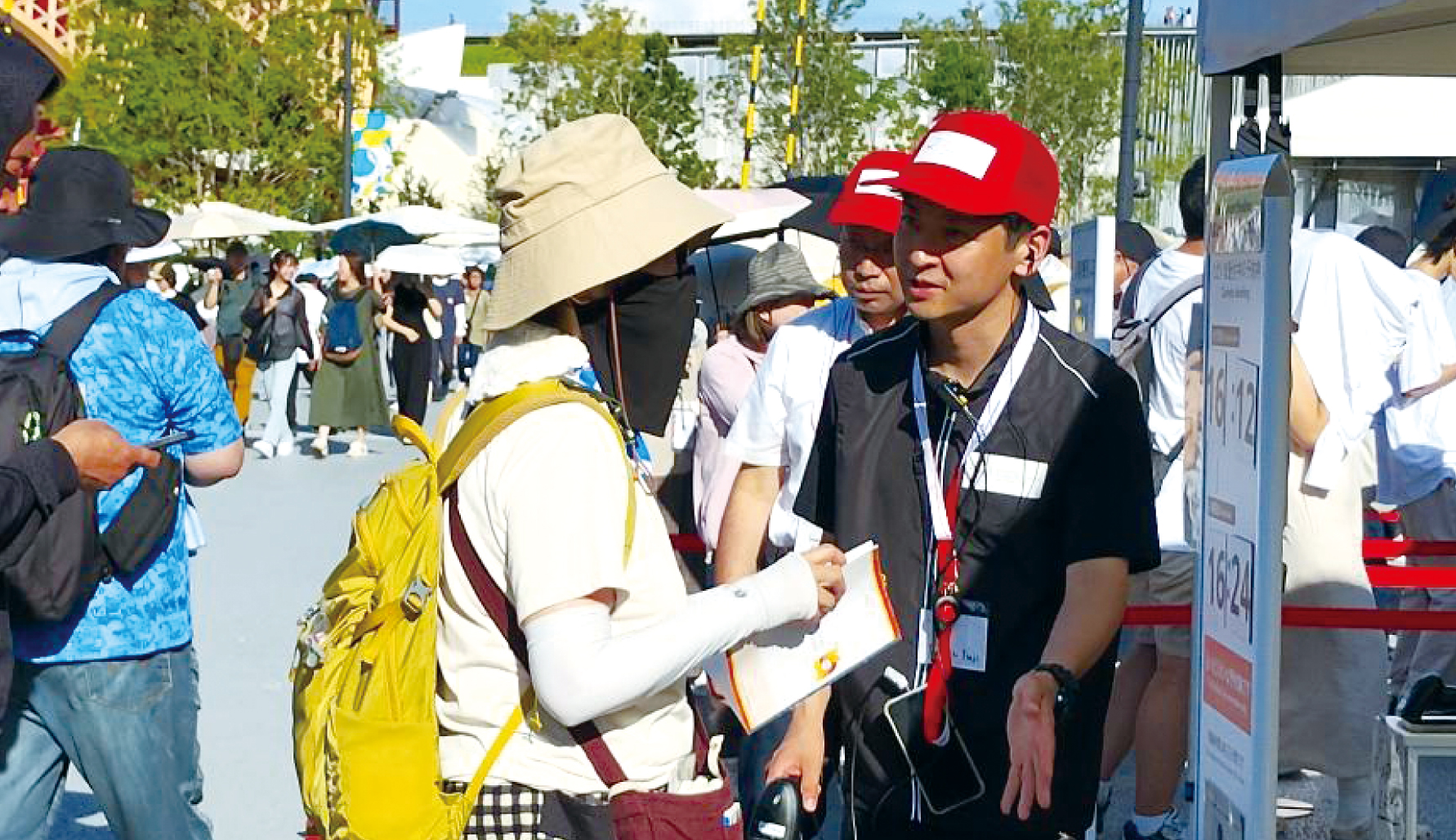 例えば、万博会場には8つの医療救護施設(医師のいる診療所3カ所・看護師のいる応急手当所5カ所)がありますが、具合が悪くなった際に近くの救護施設ではなく、赤十字パビリオンに来て体調不良を訴える方も。残念ながら当館は救護所ではないため、すぐに救護隊へ引き継ぐのですが、そんなときに活躍するのが館内で案内役を務める赤十字スタッフ。
