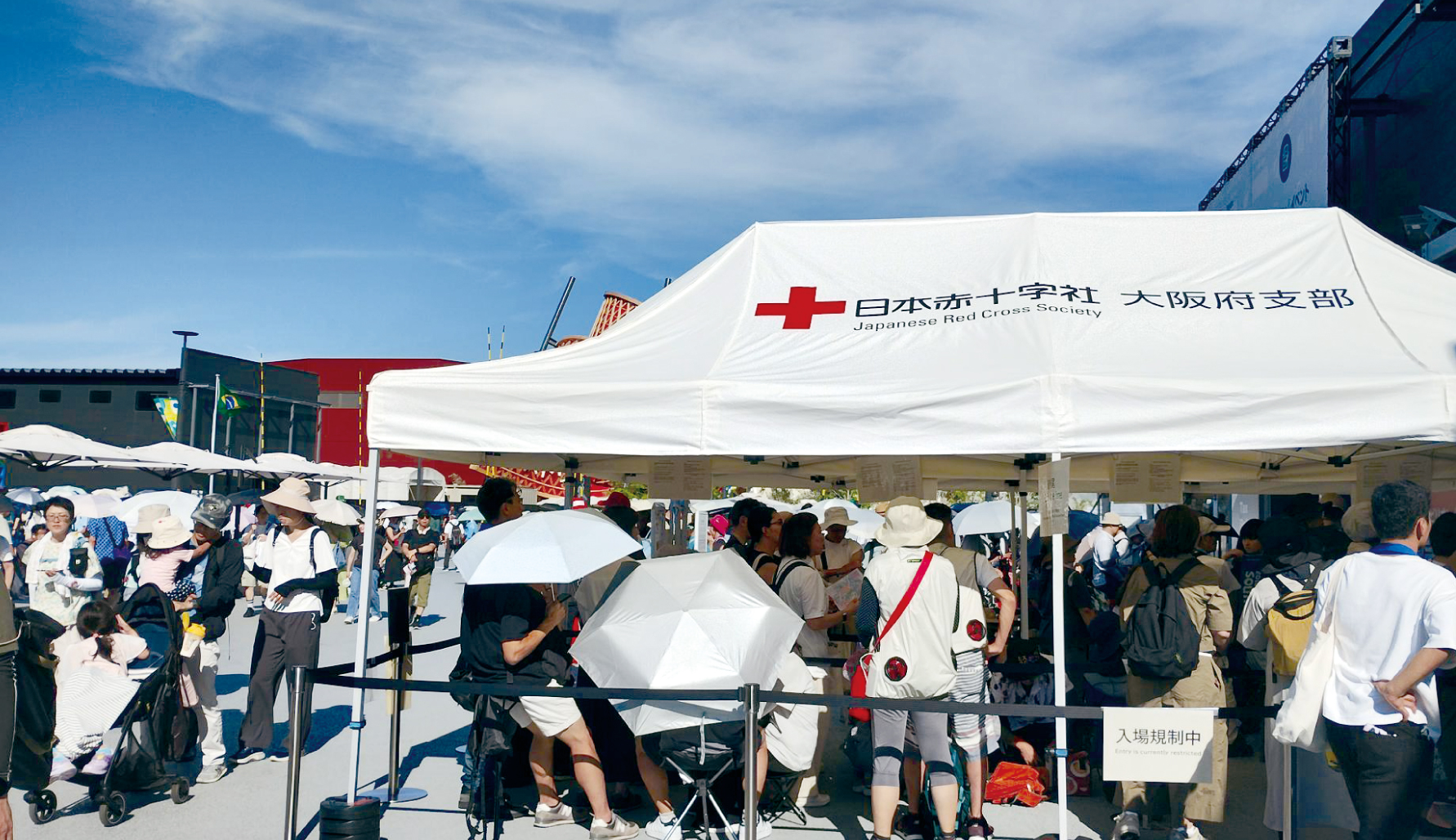 酷暑対策として、パビリオンでは気温が上がり始めた6月から日赤大阪府支部の協力のもと待機用テント3張と冷風機2台を設置。