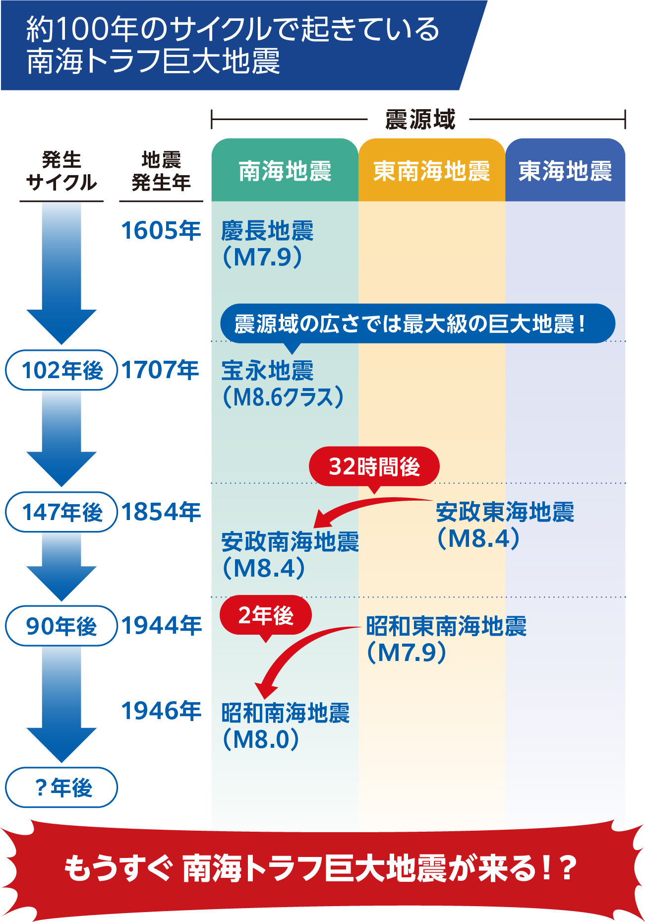 西日本の太平洋側は、約100〜150年ごとに海溝型の巨大地震に襲われてきました。これが南海トラフ巨大地震です。過去には、1707年、1854年、1946年と、規則的に発生しており、過去の例を詳しく調べると、地震の発生を挟んで内陸地震の「活動期」と「静穏期」が交互にやってくることが分かっています。