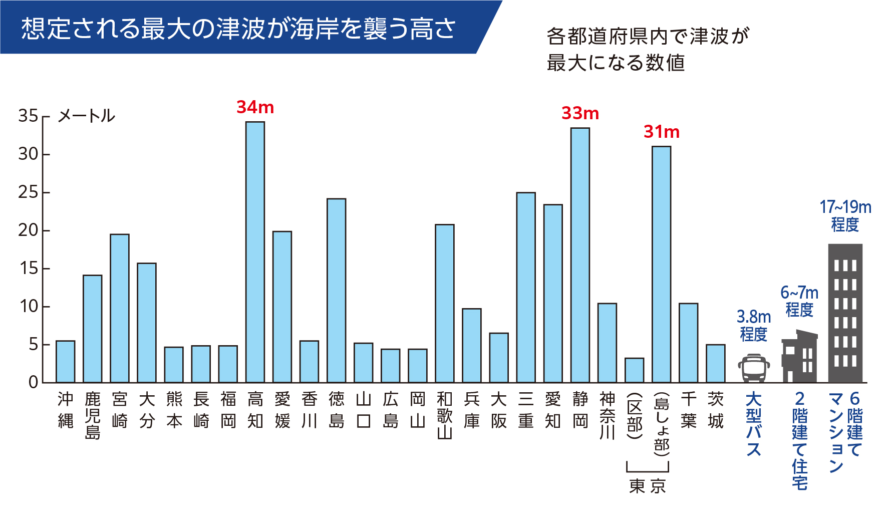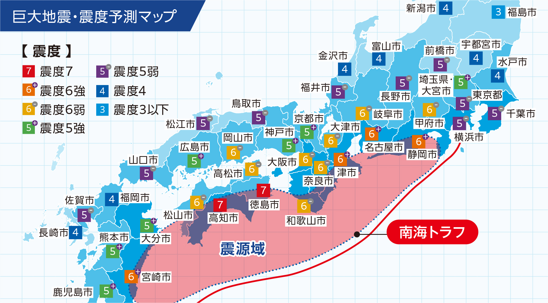 内閣府が2025年3月に発表した被害想定によると、最大規模M9.1の地震が発生したとして、複数の県が震度7の大きな揺れに見舞われ、発災時刻や風速条件にもよりますが、死者数は最大29.8万人と見込まれています。