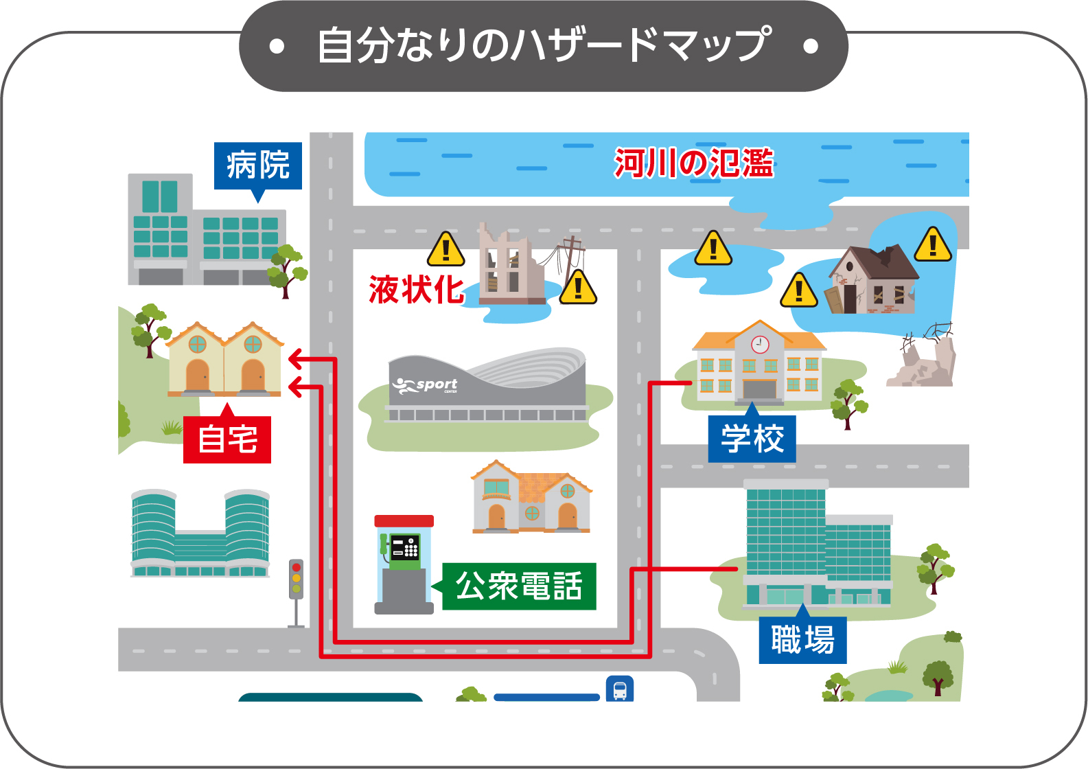 危険な場所をどのように避けて帰るか、そうするとどのくらいの時間がかかるのか、自分用のハザードマップを頭に入れておくこと。あわせて、数少なくなっている公衆電話の場所を知っておけば、いざというときに大切な人に安否の連絡ができます。そうした備えの一つ一つが、自助につながります。