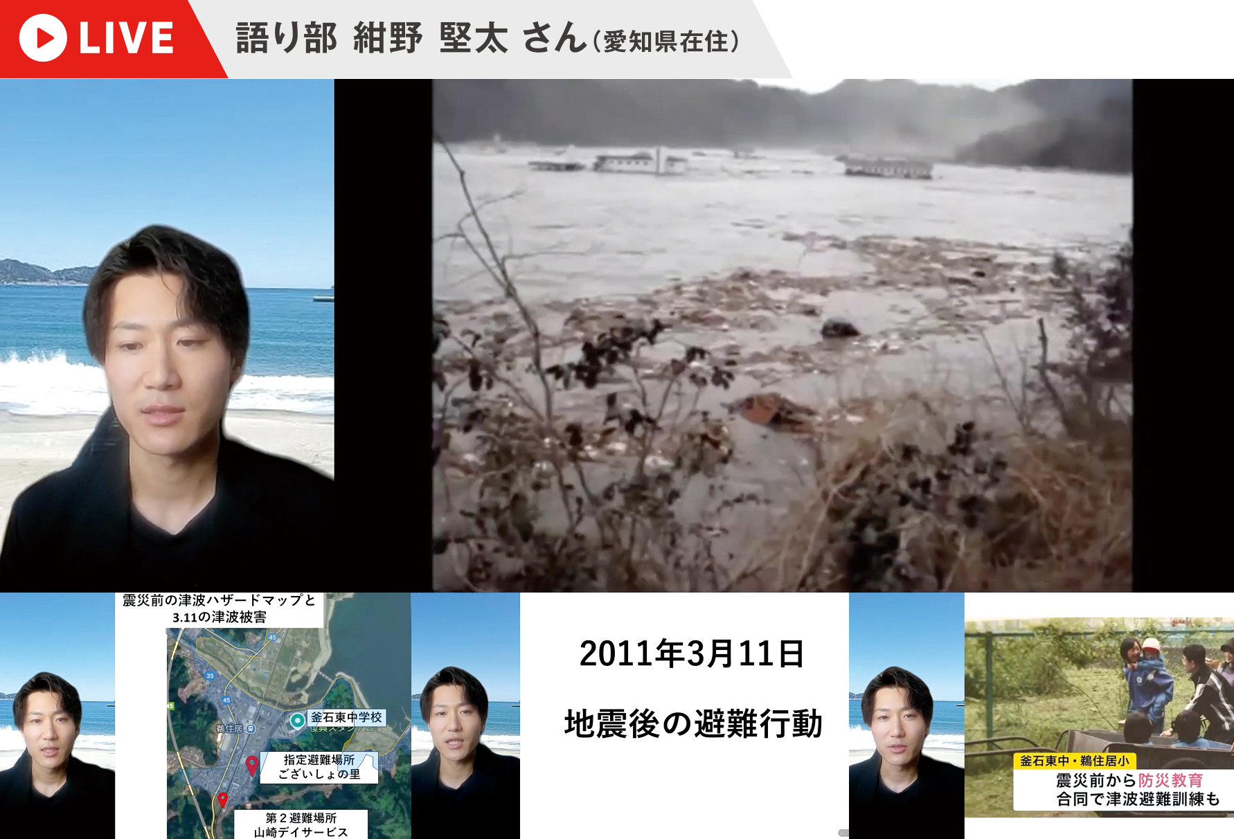 僕の姉が防災士で、家族全員の防災意識が高く、僕も防災士の資格を取得しました。東日本大震災のことは親から聞いていましたが、僕たちの地域には津波の心配はなく、その脅威の実感が湧きませんでした。でも、今日の語り部ライブで映像を初めて見て、びっくり。紺野さんは、避難訓練をしていても訓練通りにはいかなかったと話されましたが、それでも率先避難という命を守る行動ができたのは、その意識が備わっていたからだと思うので、やはり防災学習は大切だと感じました。