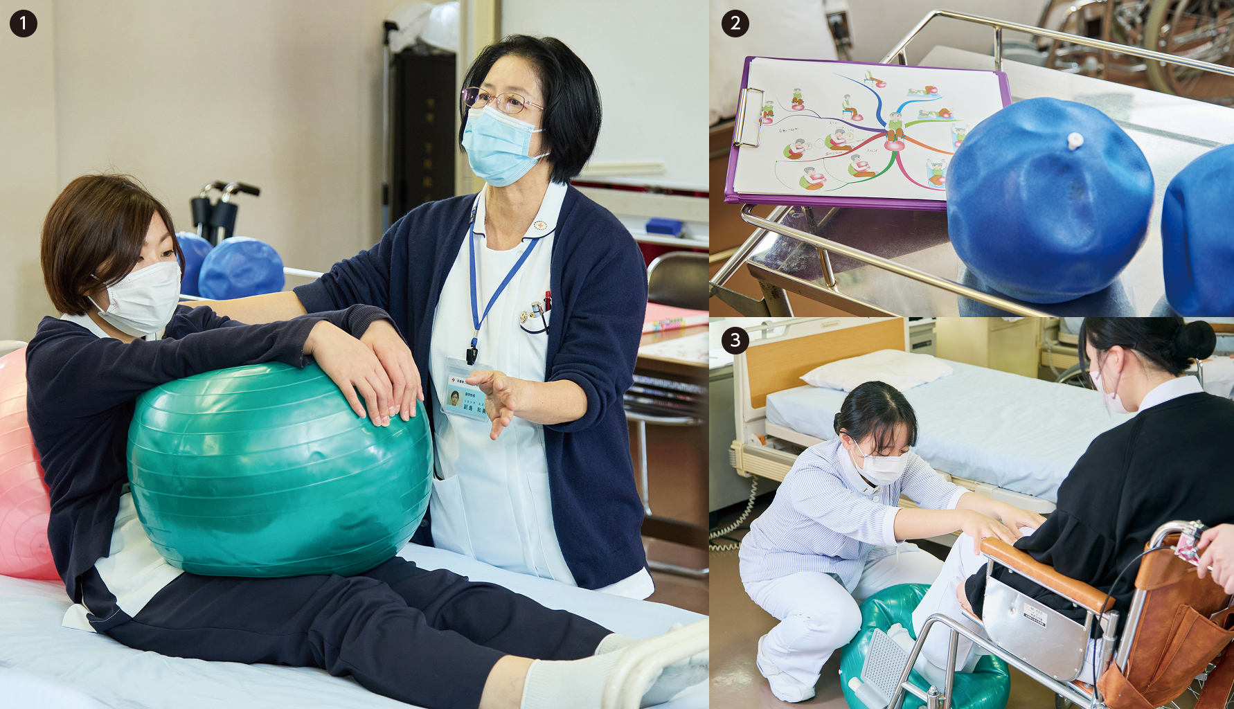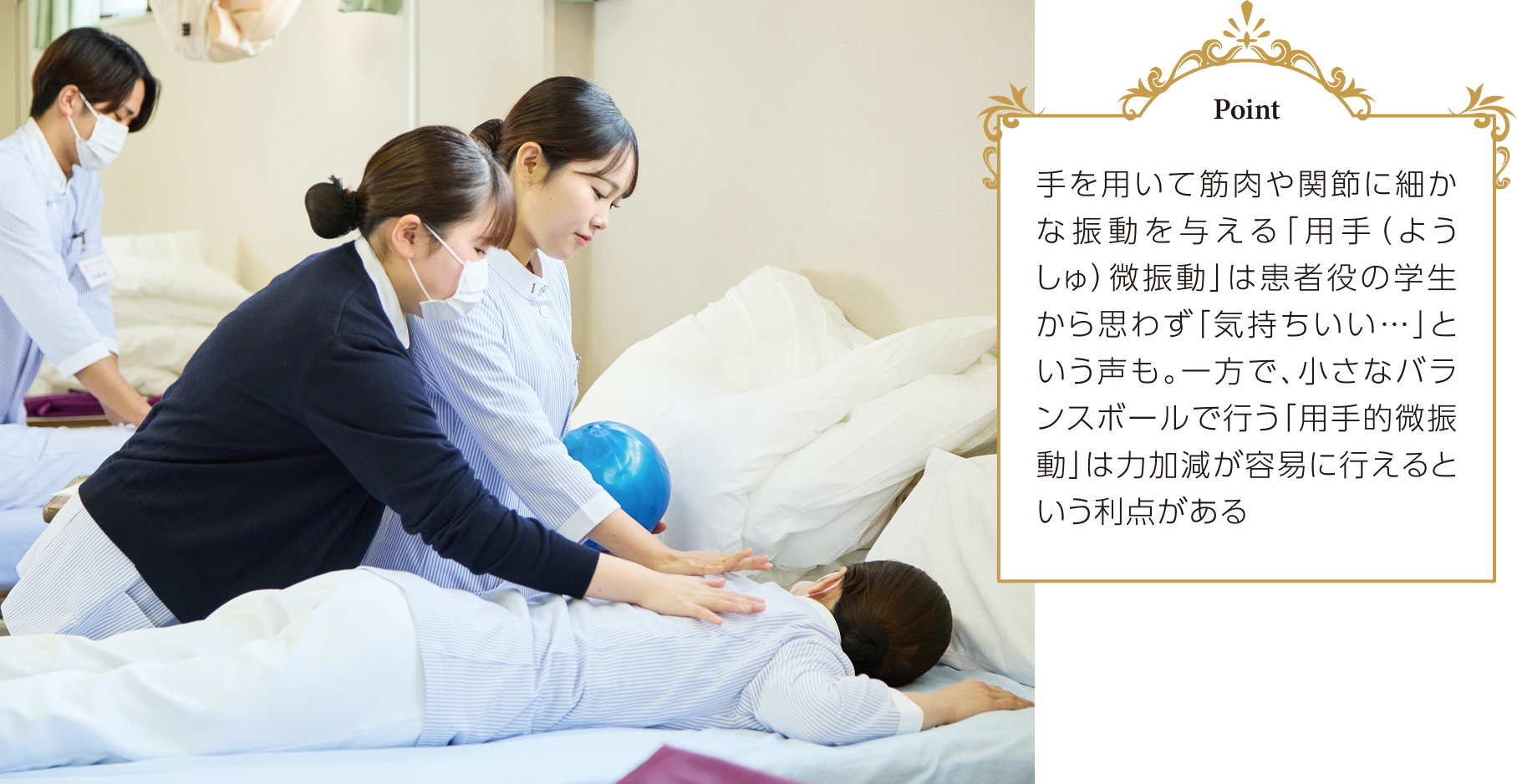 看護師は患者さんに触れさせていただきますが、体を動かすときの包み込み方や触り方一つ一つに工夫が必要なことを学びました。手を使う「用手微振動」の良さ、手の代わりのバランスボールを使った「用手的微振動」のコツや加減も、される側の感覚がわかるように学ぶ、ので、患者さんの立場になった看護を考えやすかったです。