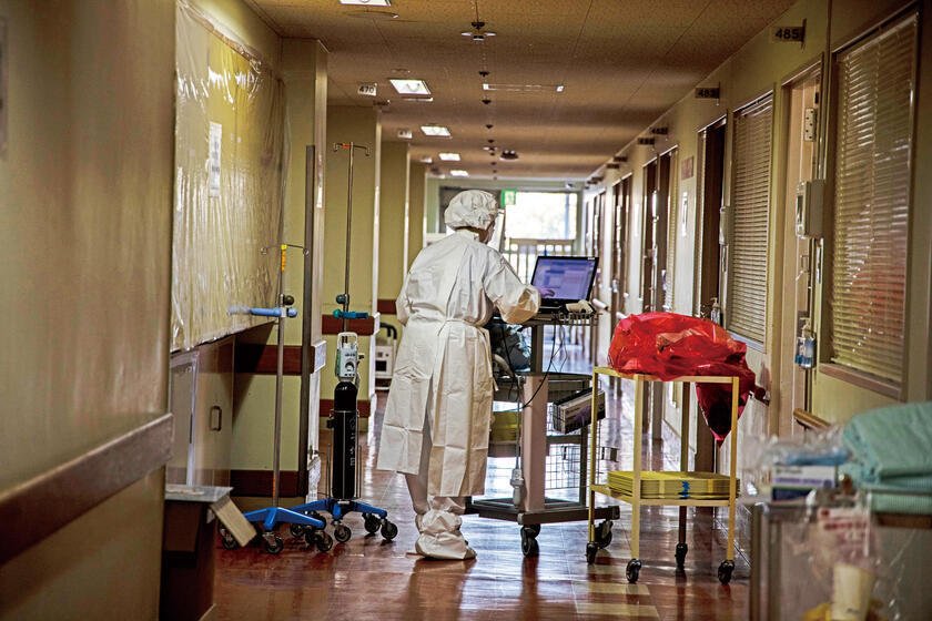 コロナ病棟では病棟全体がレッドゾーンとなり、病棟内では原則として防護服とN95マスクを着用して作業する(写真:Shibuya Atsushi/jrcs)