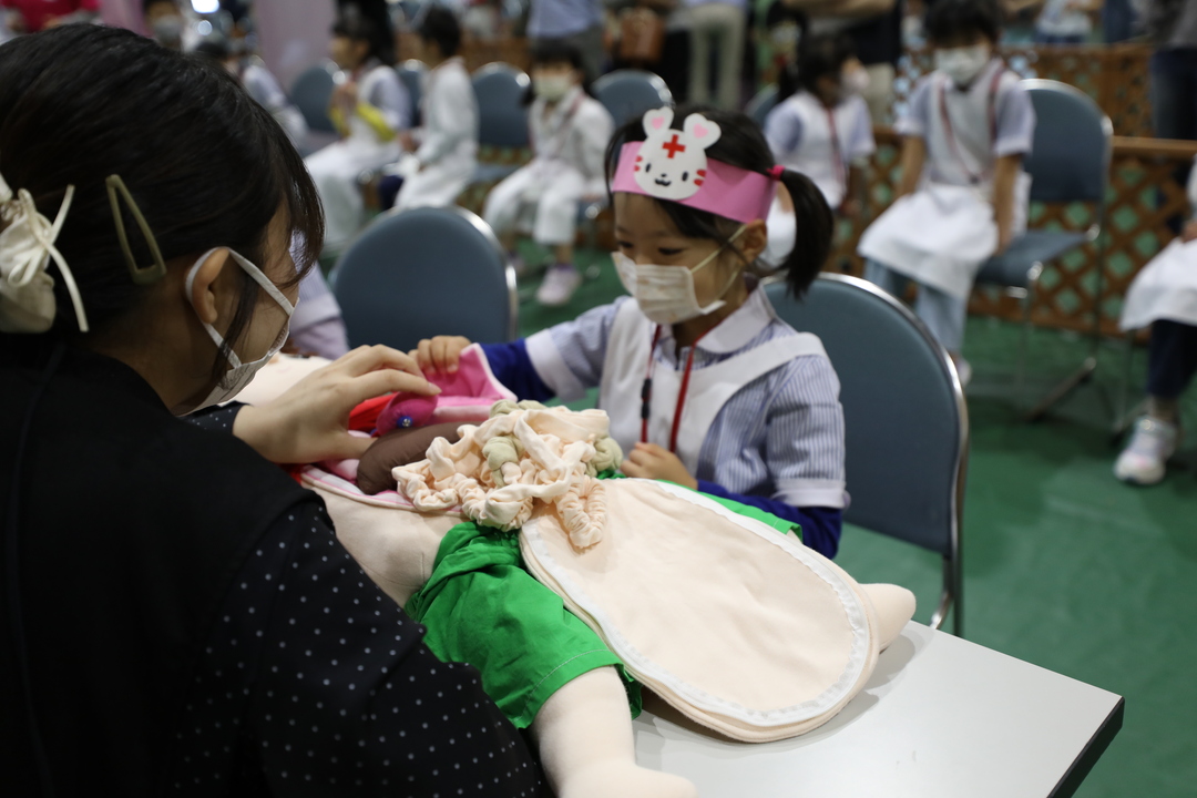 今年は午前の部・午後の部あわせて142名が参加し、災害時の救護体験や献血業務、看護師などのお仕事体験を真剣な表情で取り組んでいました。