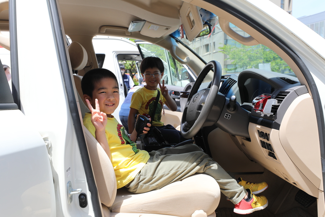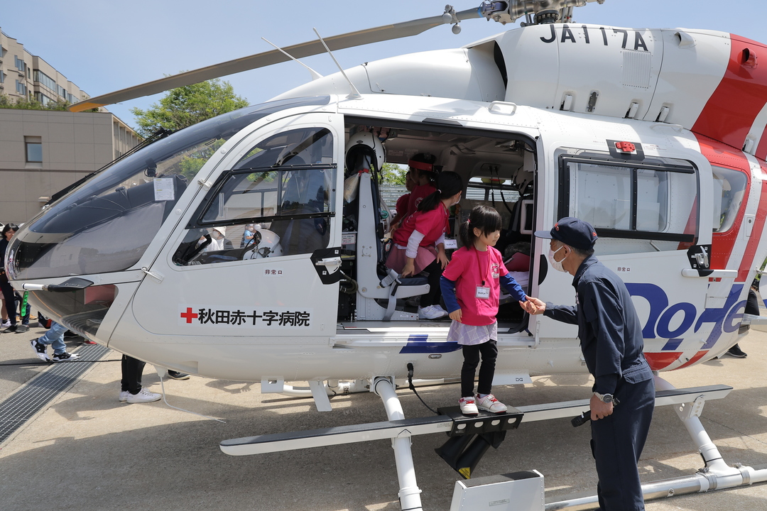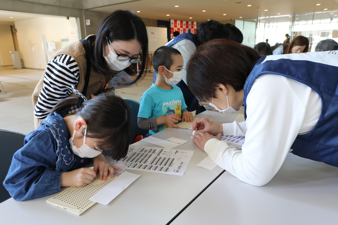 お仕事体験以外にも「県民防災の日」にちなんだ地震体験車の乗車や秋田赤十字病院のドクターヘリの見学、点訳奉仕団による点字体験、秋田市赤十字奉仕団と秋田北高校JRC部による「ハートラちゃん」ワッペン作り、災害救援車両への乗車や炊き出しなど、赤十字に関する様々な体験を楽しんでいました。