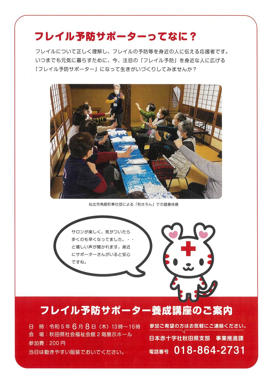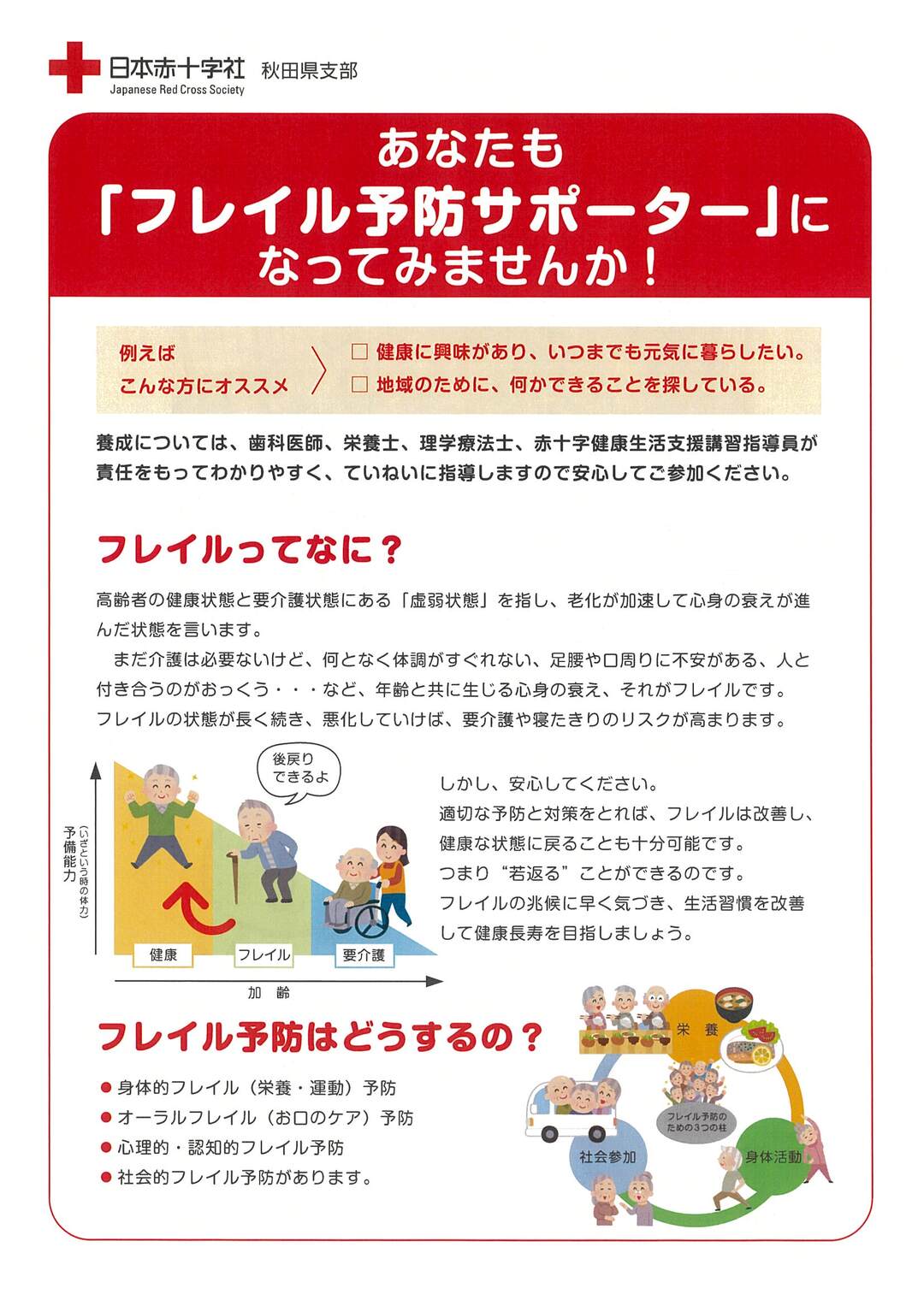 そこで、秋田県支部では、介護予防・生活支援の分野で貢献するため、令和6年度から「フレイル(※)予防サポーター」を養成し、地域包括ケアシステム推進体制の充実を図っています。