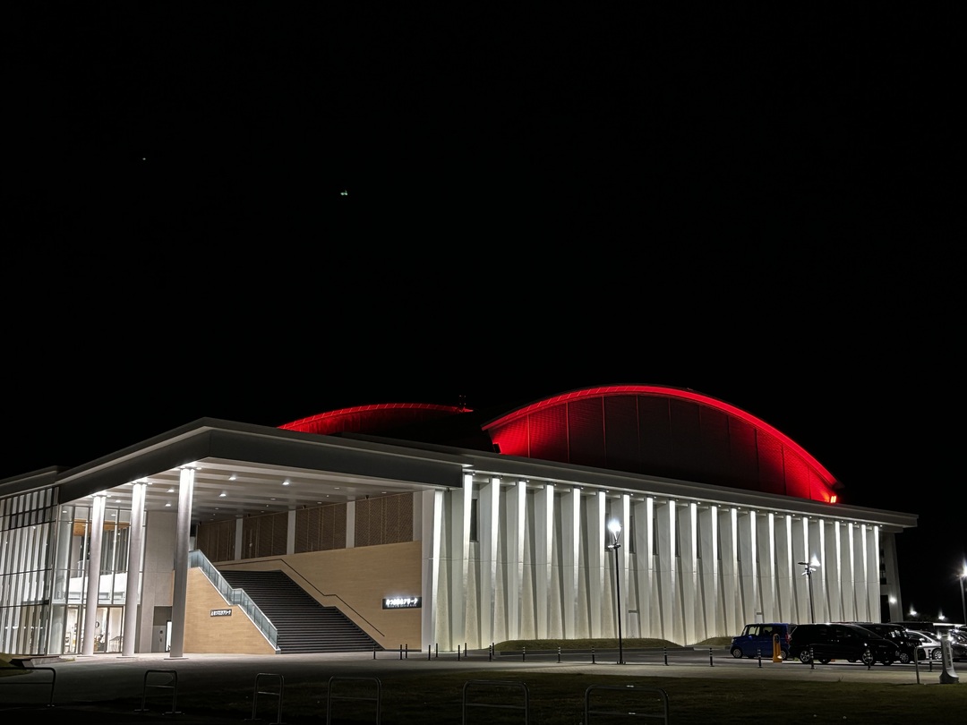 今年も昨年に引き続き、世界遺産白神山地にある「津軽ダム」(国土交通省 東北地方整備局 岩木川ダム統合管理事務所 様)、ヴァンラーレ八戸(J3)のホームスタジアムである八戸市多賀多目的運動場「プライフーズスタジアム」(八戸スポーツ・地域振興グループ 株式会社ヴァンラーレ八戸 様)、むつ市内3ヵ所(むつマエダアリーナ、北の防人大湊 海望館、大橋*)でライトアップを行い、ダムの巨大な堤体等が赤十字のシンボルカラーに染まりました。
