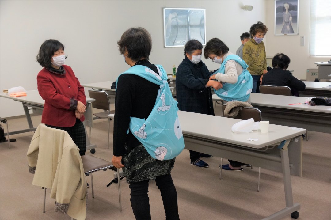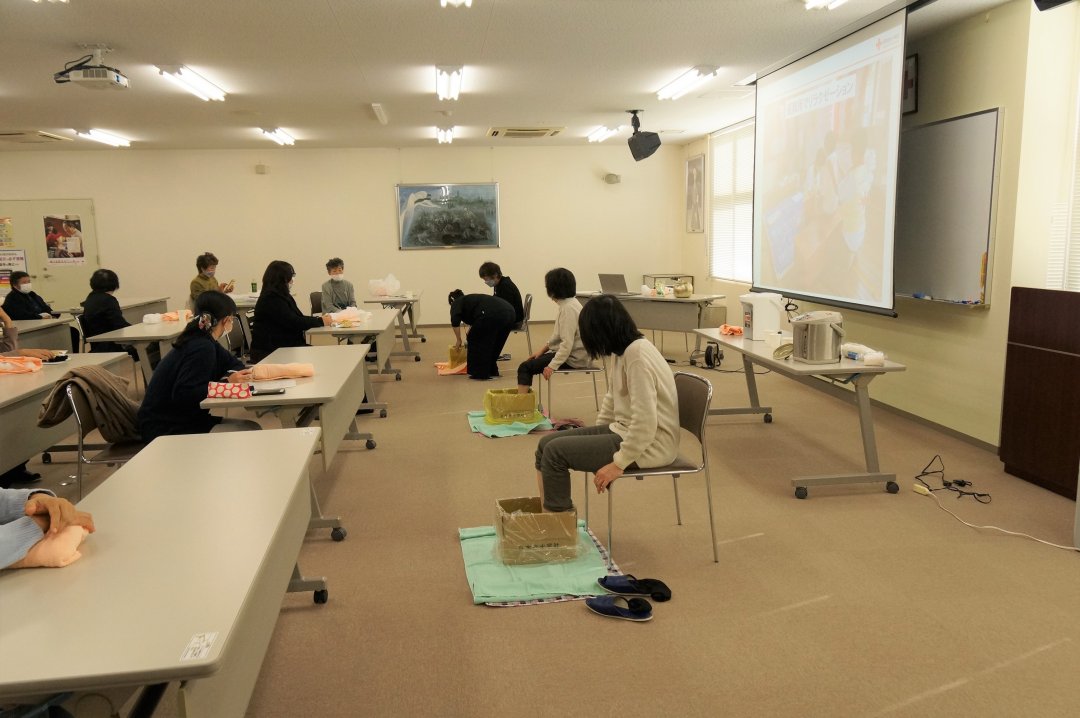 赤十字がどのような活動をしているのか、どういった救護資器材を備えているのか等をご紹介した後、「災害時における高齢者の支援」について体験を含めて学んでいただきました。