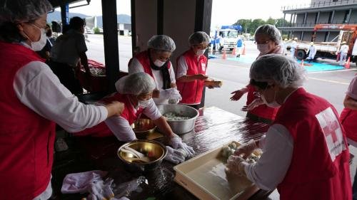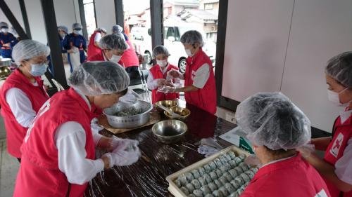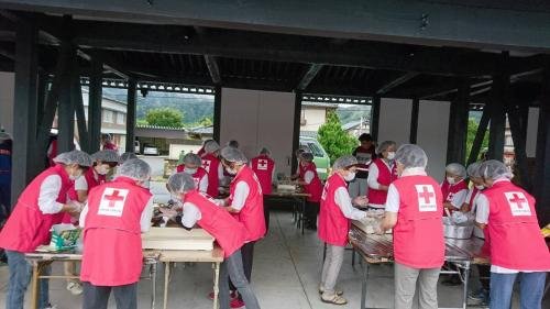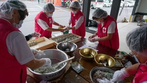 大野市総合防災訓練が「防災の日」の9月1日、市役所に隣接する城下町南広場や市役所駐車場などで開かれました。 近隣住民や市職員、市消防団員をはじめ、市と災害支援協定を結ぶ団体などから計約700人が参加。 大野市赤十字奉仕団(藤堂朱実委員長)の団員25名が参加しておにぎり600個を作り配布し、“美味しい奉仕”に参加者は喜んでいました。 同団は、巨大地震を想定した訓練を通してそれぞれの役割を確認し、防災意識を高めました。