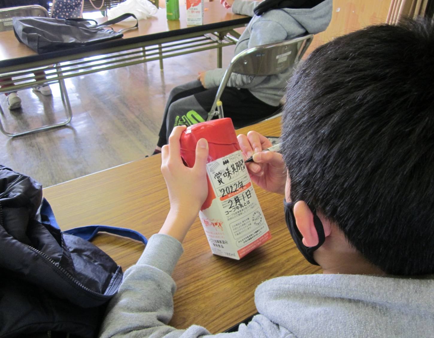 パックに賞味期限を書き込む児童