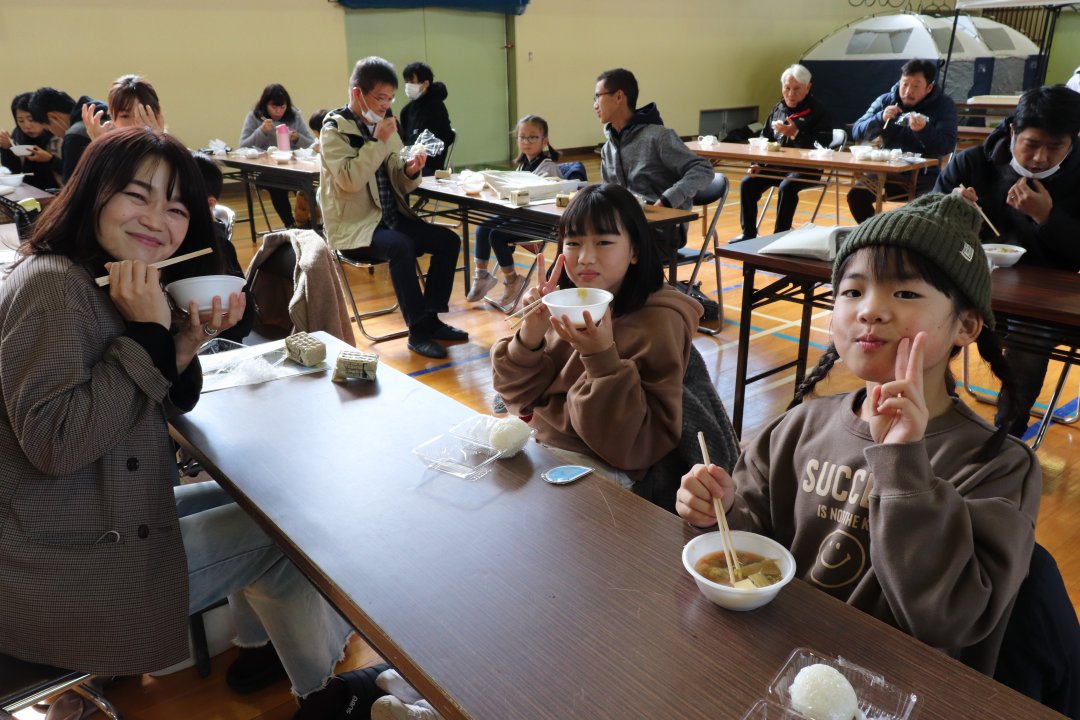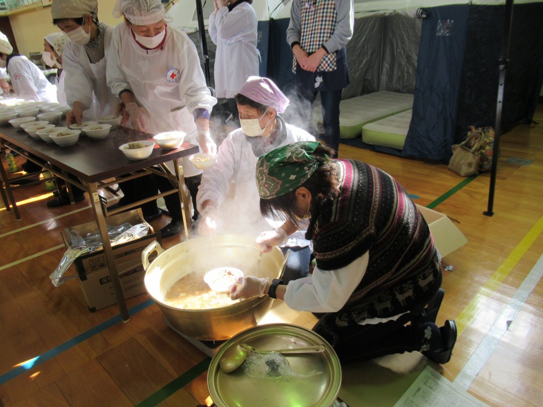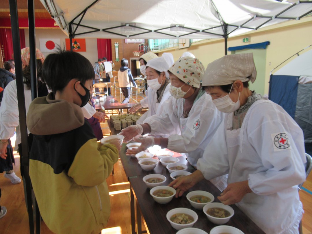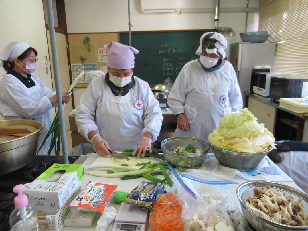 勝山市赤十字奉仕団は12月5日、同市の平泉寺公民館で行われた『家族で考えよう 防災教室』で、炊き出し実習を行いました。