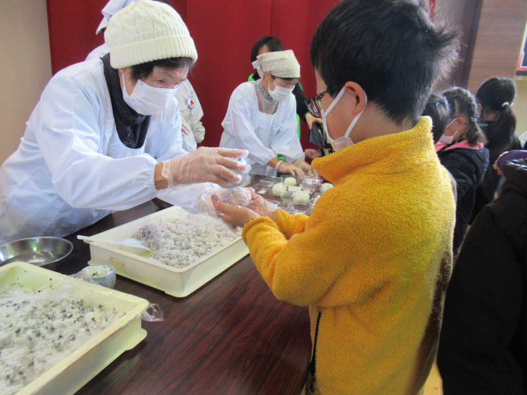 今回は奉仕団から10名が参加し、地元で作られた米や野菜を使いおにぎりと豚汁を作りました。子どもたちもおにぎり作りを手伝い、自分で出来る役割を考えながら奉仕団員と共に調理を行いました。試食では、子どもたちから「ご飯が美味しい」と声があがりました。