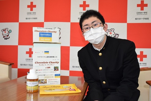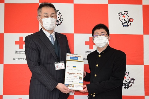3月16,17日に、『チョコレート・チャリティー』と題してウクライナ産の菓子やハチミツを校内で販売しました。生徒・先生らが買い求め、用意した品物は完売。3月23日、支部を訪れ、売上の19,789円をご寄付いただきました。