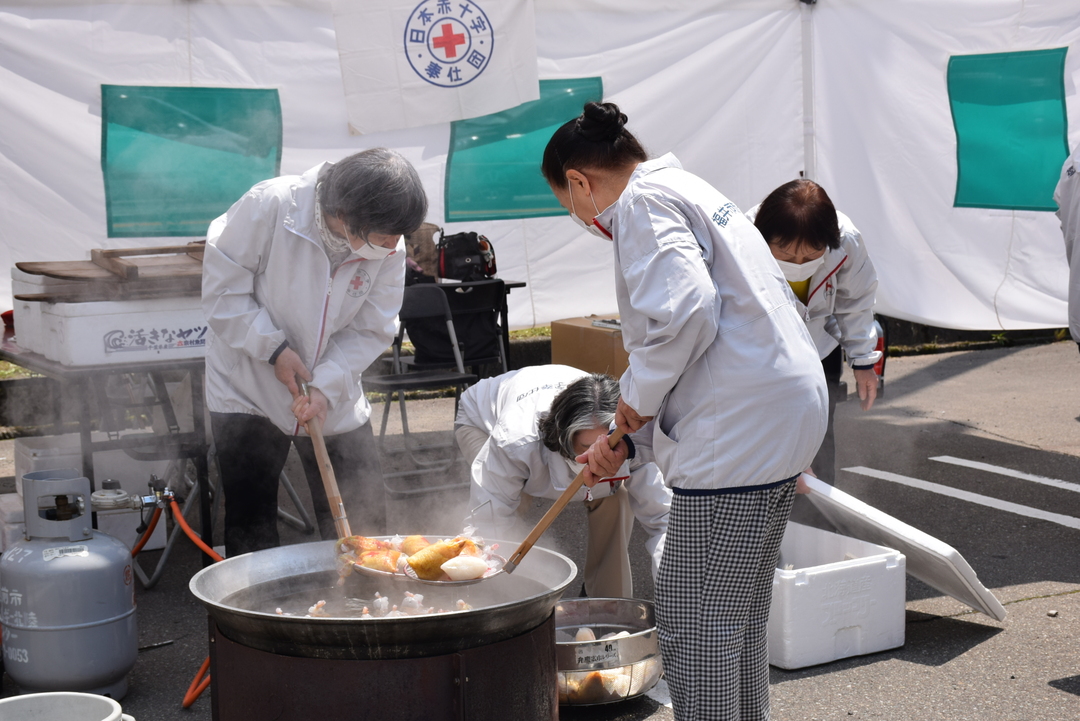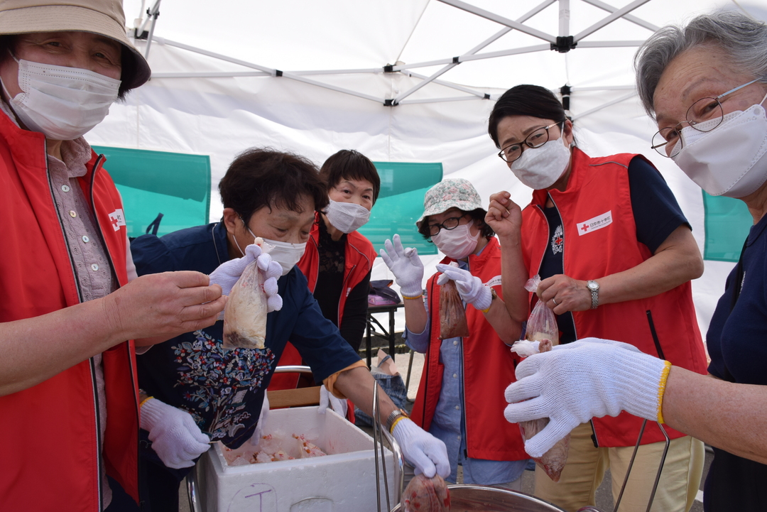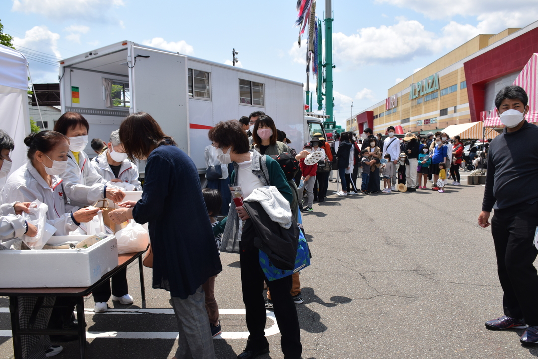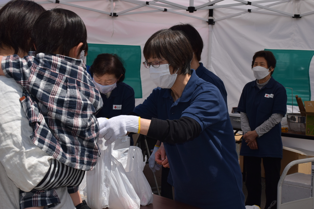 ハイゼックスを使った炊き出しの無料配布では、配布の時間になると行列ができていました。奉仕団の方から炊き出しを受け取ると、皆嬉しそうに中身を覗いていました。