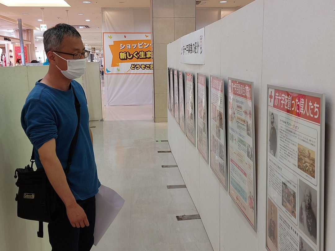 館内の赤十字パネル展では、買い物に来た方が足を止めてじっくりとパネルを眺めていました。赤十字の活動に興味を持ち、設置していた広報用のパンフレットを持ち帰る人もいました。